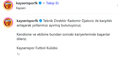 Kayserispor, teknik direktör Radomir Djalovic ile karşılıklı anlaşmaya vararak sözleşmenin sona erdirildiğini açıkladı.