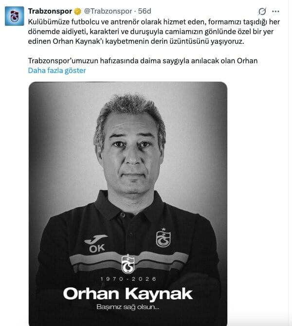 Trabzonspor Kulübü, Orhan Kaynak’ın vefatının ardından yayımladığı mesajda derin üzüntü duyduklarını belirtti. Açıklamada, Kaynak’ın hem futbolcu hem de antrenör olarak kulübe önemli katkılar sunduğu vurgulanarak, “Kulübümüze verdiği emek, sahadaki mücadelesi ve karakteriyle camiamızın gönlünde özel bir yer edinmiştir. Trabzonspor’un hafızasında daima saygıyla anılacaktır” ifadeleri kullanıldı.